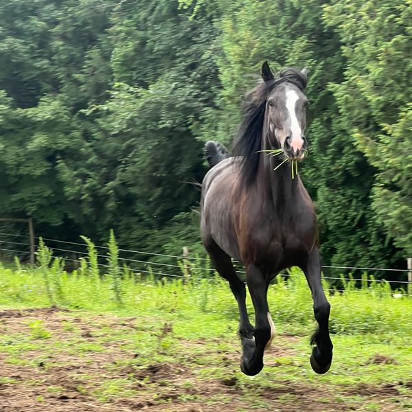 Sarafina is our boarder and joined the herd in August 2025. A 5-year-old shire and warmblood cross mare, Sarafina is a sweet girl who loves her new paddock mate, Zeena. She loves meal times, back scratches from mom, Kasia, and second mom, Brittany, and always supervises the cleaning of her stall and pasture.